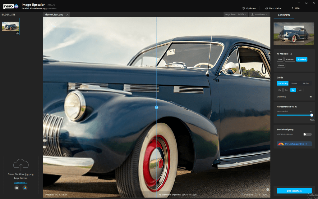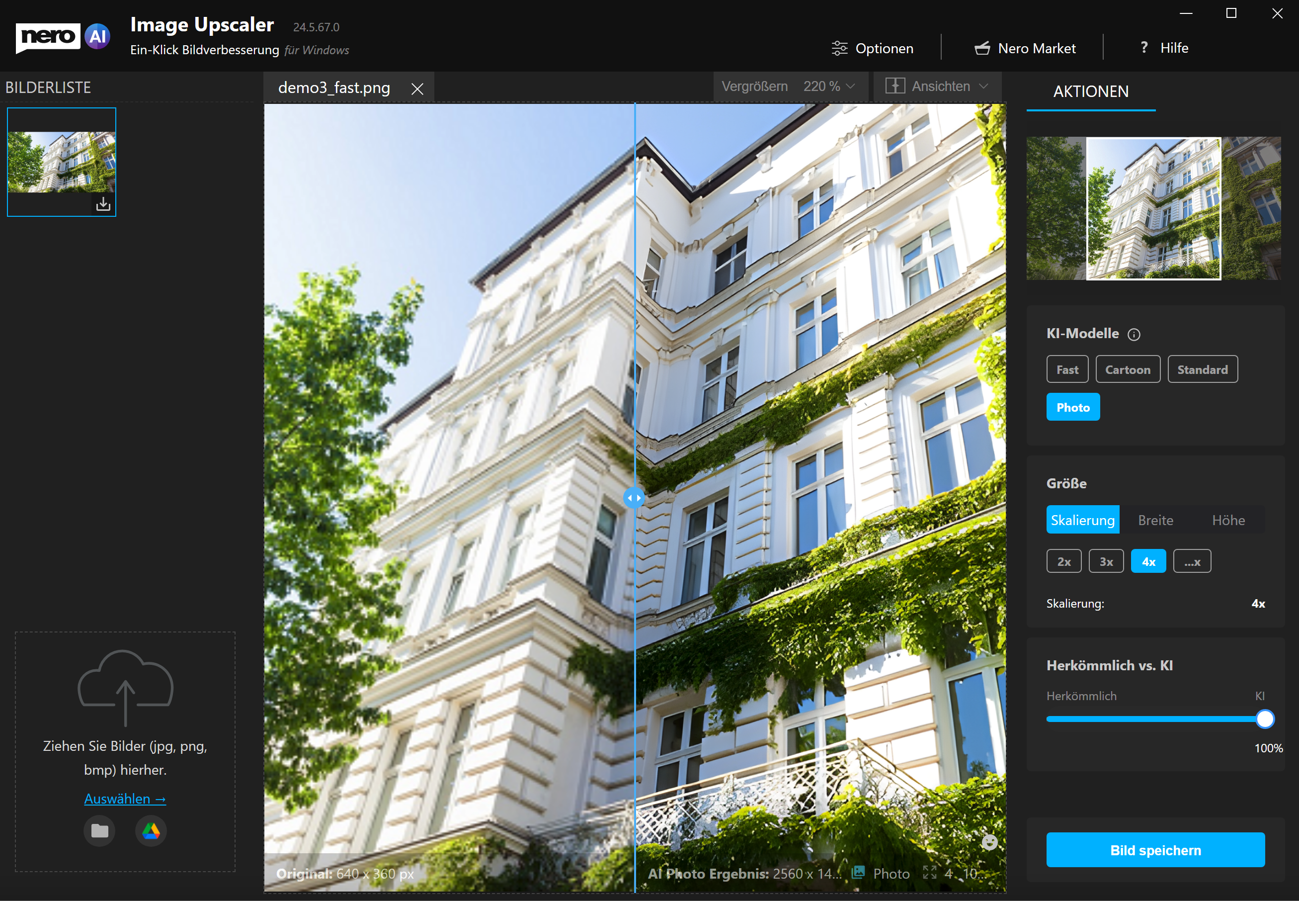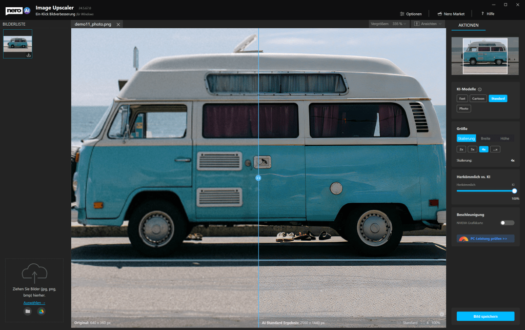 Über einen Schieberegler können Sie das KI-Ergebnis mit einem herkömmlich skalieren Ergebnis mischen und so den KI-Effekt gegebenenfalls etwas abmildern.