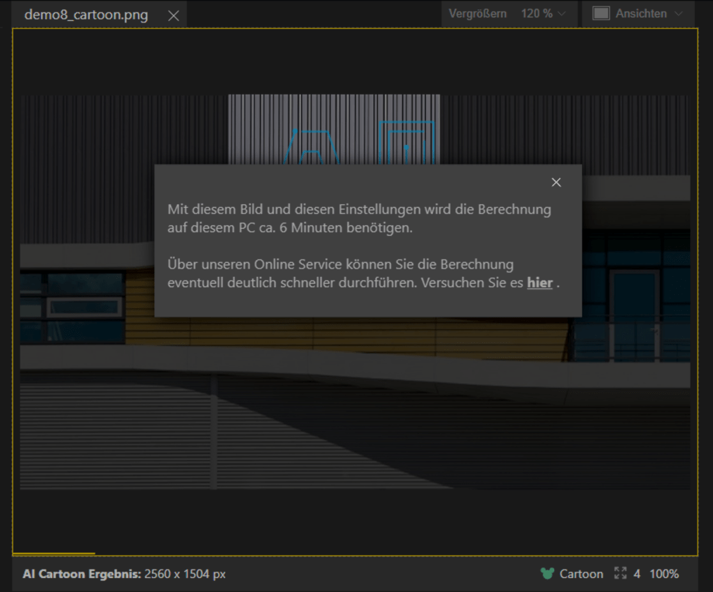 Hier noch eine Übersicht der Beispielbilder von Nero und des KI-Models, welches standardmäßig angewendet wird. Ohne Grafikkarten-Beschleunigung dauert eine Berechnung mit Standard/Photo/Cartoon schnell mal 10 Minuten oder mehr. In diesem Fall sollte man eigentlich das "Fast"-Modell anwenden (etwas geringere Qualität, je nach Bild) oder gleich den Online-Dienst verwenden. Wenn Sie sich dort mit Ihrem Nero-Account anmelden können Sie pro Tag 5 Bilder kostenfrei berechnen. Die Anwendung informiert Sie dahingehend, sobald eine erste Einschätzung der zu erwartenden Gesamtdauer vorliegt.