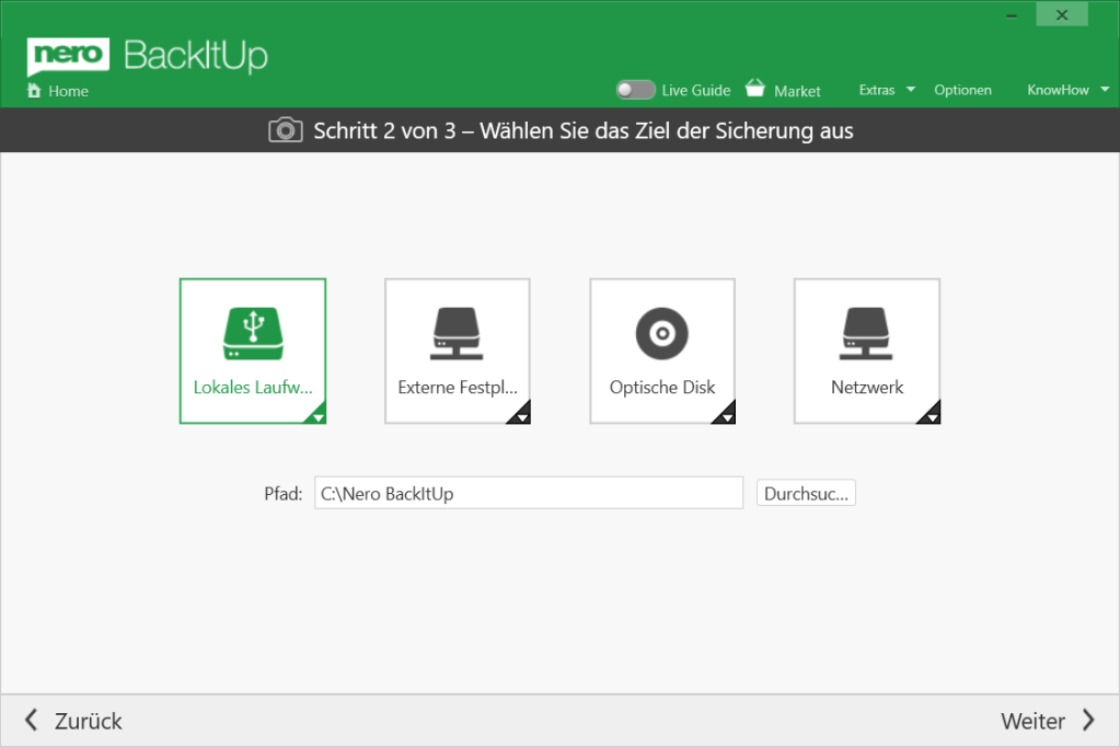 2. Wählen Sie das Ziel der Sicherung aus - Lokale Laufwerke, externe Festplatten, optische Disks, Netzwerklaufwerke (NAS) und viele Cloud-Speicher werden unterstütz.