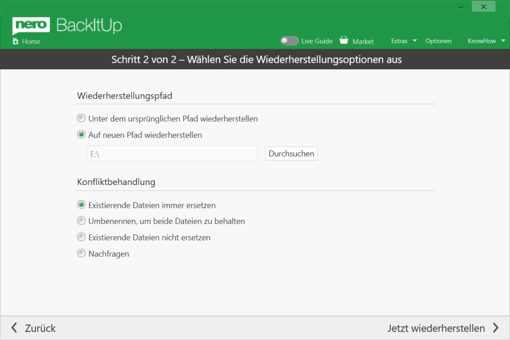 2. Wählen Sie die Wiederherstellungsoptionen aus - Legen Sie fest wohin die Daten geschrieben werden sollen und bestimmen Sie, was mit Duplikaten passiert. Schon sind alle Daten wieder an Ort und Stelle.
