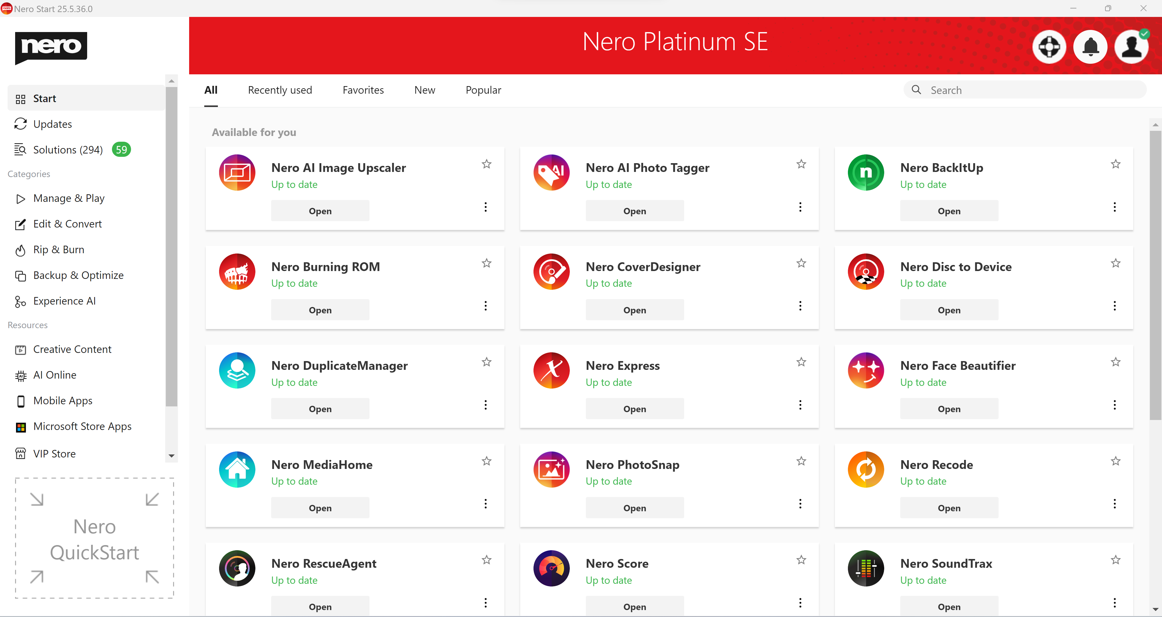 Nero Start is designed to be a one-stop-shop for all your multimedia needs. With a sleek and modern interface, it allows users to easily access all 406 solutions included in the Nero Platinum suite. Using the 'recently used' and 'favorites' filters, you can quickly find and open your frequently used apps, while the 'what's new' and 'popular' filters show you the latest apps used by other users and the most popular apps, respectively.