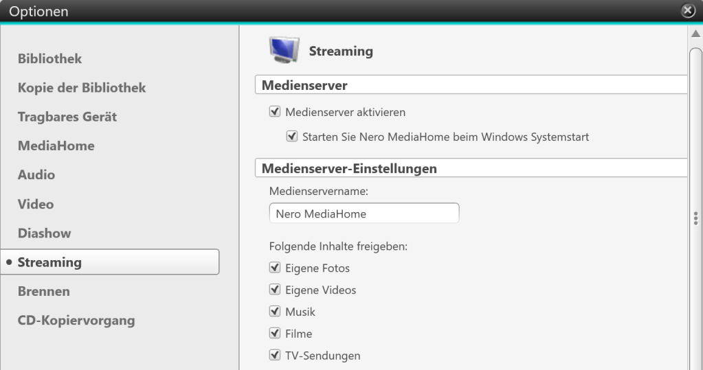 Und Sie müssen dazu nicht einmal an ihrem PC sitzen. Es genügt, wenn sie in den Optionen den Haken bei "Starten Sie Nero MediaHome beim Windows Systemstart" setzen. Damit verwandeln Sie ihren PC in einen mächtigen Streaming-Server, der ihre Medien jederzeit über ihr WLAN/LAN ausliefert und dabei Dateien gleich noch ins richtige Format transkodiert.