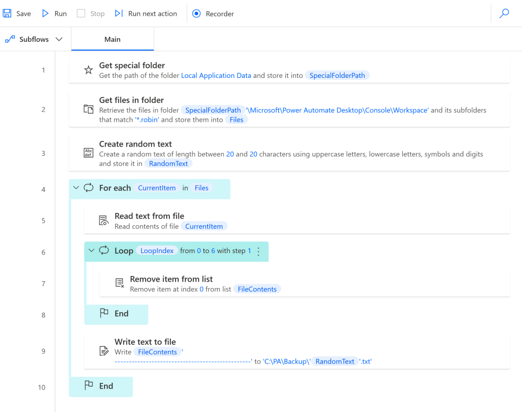 Folder.GetSpecialFolder SpecialFolder: Folder.SpecialFolder.LocalApplicationData SpecialFolderPath=> SpecialFolderPath Folder.GetFiles Folder: $'''%SpecialFolderPath%\\Microsoft\\Power Automate Desktop\\Console\\Workspace''' FileFilter: $'''*.robin''' IncludeSubfolders: True FailOnAccessDenied: True SortBy1: Folder.SortBy.NoSort SortDescending1: False SortBy2: Folder.SortBy.NoSort SortDescending2: False SortBy3: Folder.SortBy.NoSort SortDescending3: False Files=> Files Text.Random UseUpperCaseLetters: True UseLowerCaseLetters: True UseDigits: True UseSymbols: False MinimumLength: 20 MaximumLength: 20 RandomText=> RandomText LOOP FOREACH CurrentItem IN Files File.ReadTextFromFile.ReadTextAsList File: CurrentItem Encoding: File.TextFileEncoding.UTF8 Contents=> FileContents LOOP LoopIndex FROM 0 TO 6 STEP 1 Variables.RemoveItemFromList.RemoveItemFromListByIndex ItemIndex: 0 List: FileContents END File.WriteText File: $'''C:\\PA\\Backup\\%RandomText%.txt''' TextToWrite: $'''%FileContents% ------------------------------------------------''' AppendNewLine: True IfFileExists: File.IfFileExists.Append Encoding: File.FileEncoding.Unicode END Note: This backup will only backup the flows that have at least run once on this PC using the "Play" button on the main screen of PAD. If you have created your flows on a different machine and have never run them on this machine, they will still show up inside PAD, but they won't be available as local .robin files for backup.