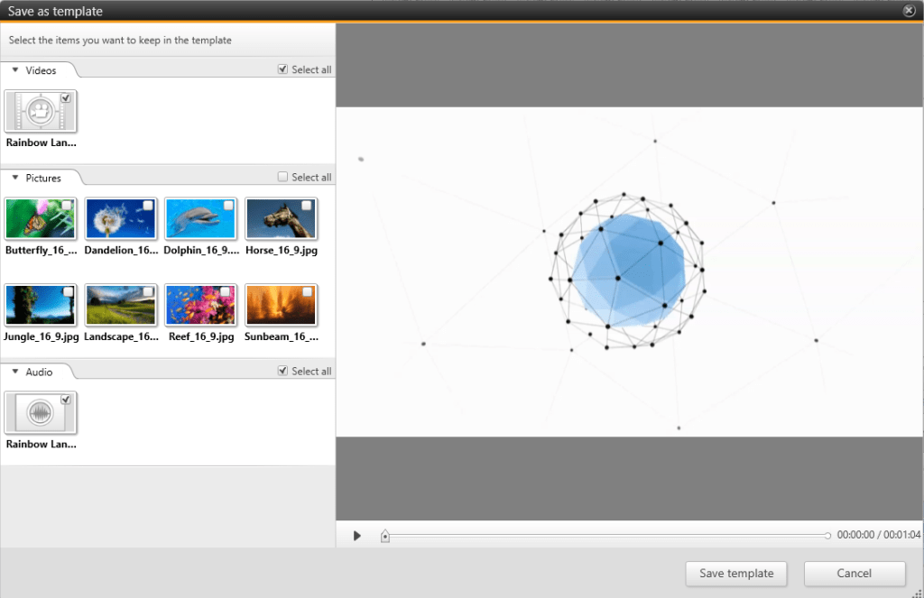 Tip: The template will be saved as one big file containing all assets, with the file extension .nvt, if you would like to share the template with others you should try to keep the file sizes of the individual assets as small as possible (e.g. low bitrate for audio/video clips and strong compression, pictures as .JPG instead of larger file formats)
