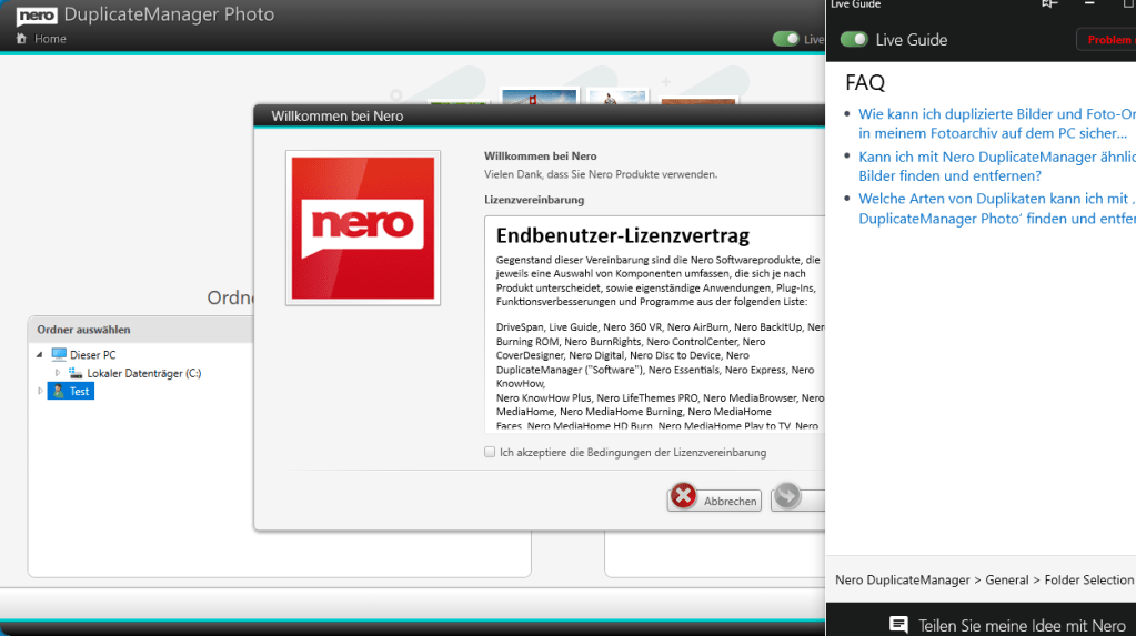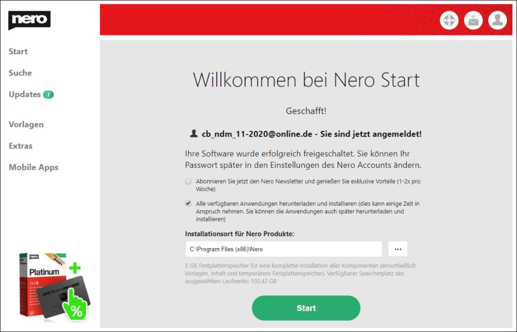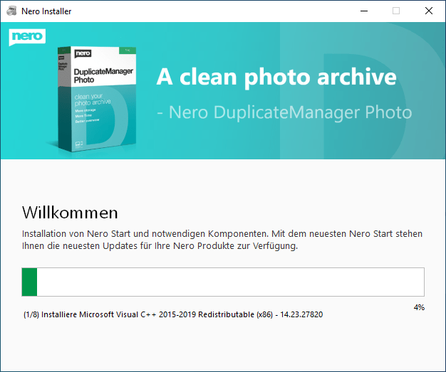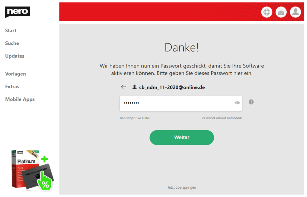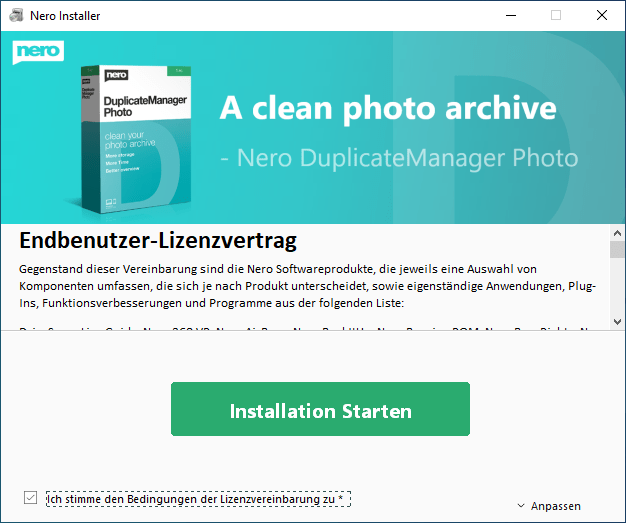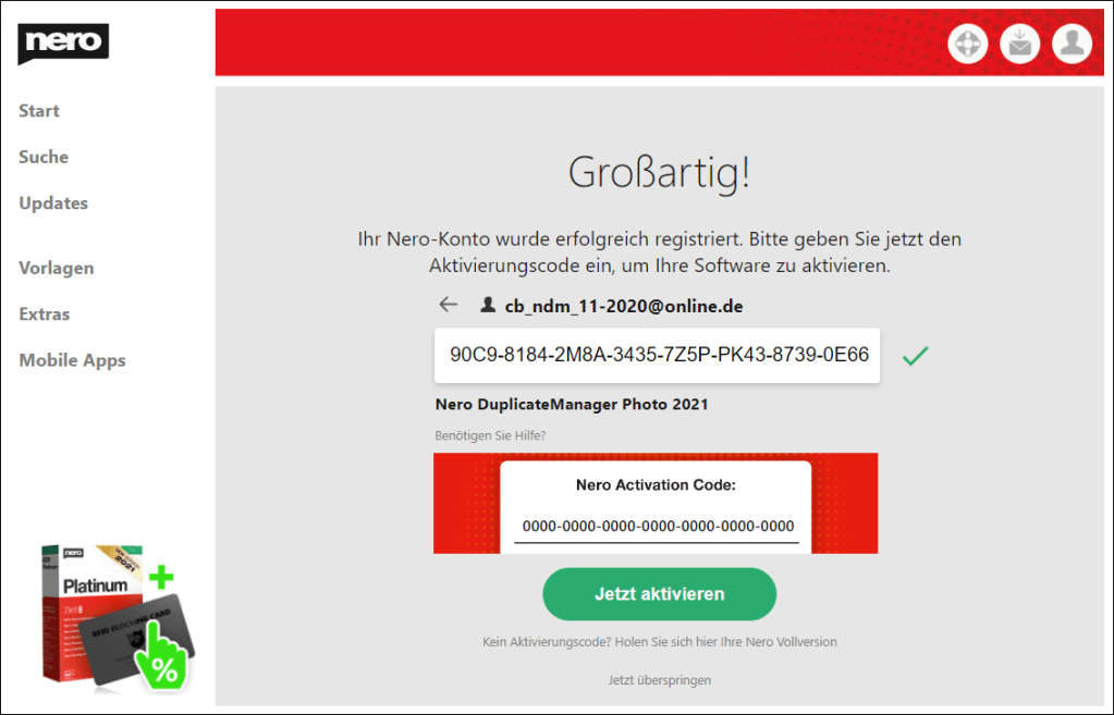 Nach dem Erhalt starten Sie die InstallationNach abgeschlossener Installation öffnen Sie mit "Starten" die Schaltzentrale "Nero Start"Geben Sie dort Ihre Email-Adresse einGeben Sie das Passwort ein, welches an diese Adresse gesendet wurdeGeben Sie hier Ihren Aktivierungscode einLassen Sie diesen Hake gesetzt, um alle Software zu erhalten oder entfernen Sie Ihn für gezielte InstallationNero DuplicateManager ist sofort verfügbar, weitere kostenlose Anwendungen werden herunter geladenDen Fortschritt sehen Sie auf der Startseite und unter "Updates"Eventuell schließt sich Nero Start um sich selbst zu aktualisieren, öffnen Sie ihn dann erneut, kurz darauf ist alles benutzbarBeim ersten Start des Nero DuplicateManager akzeptieren Sie die EULA, der Live Guide erleichtert Ihnen den Einstieg