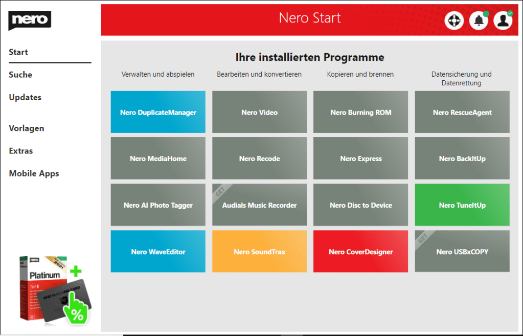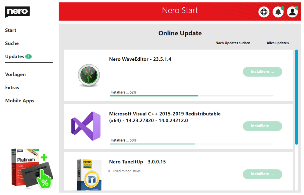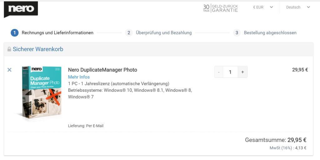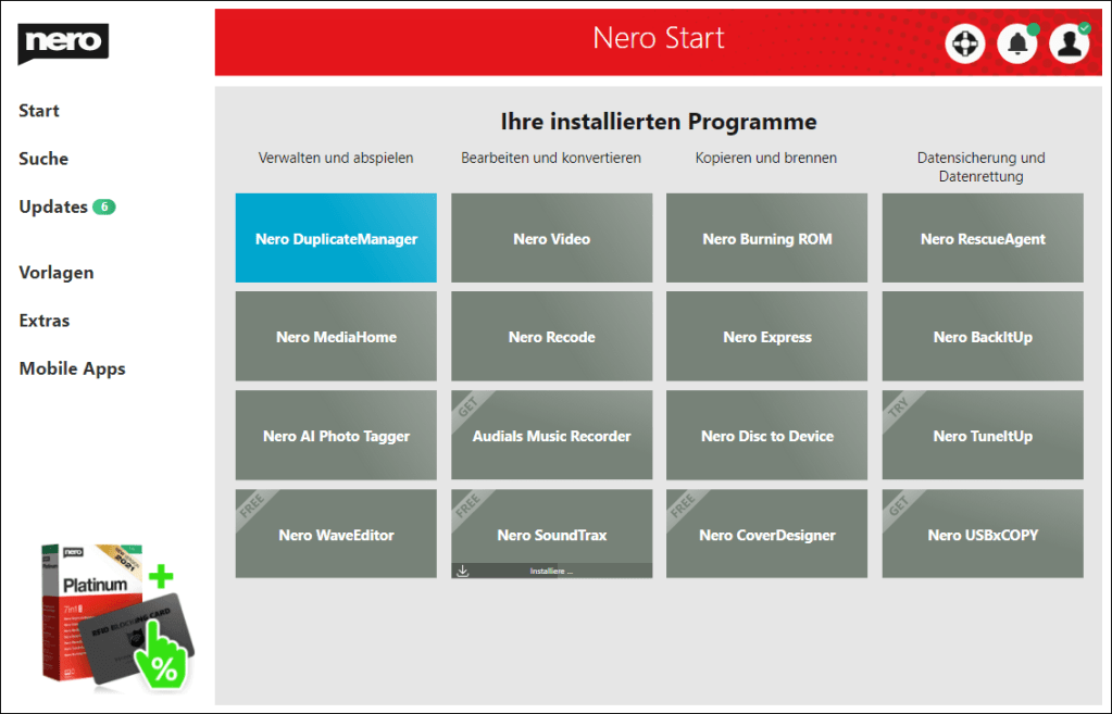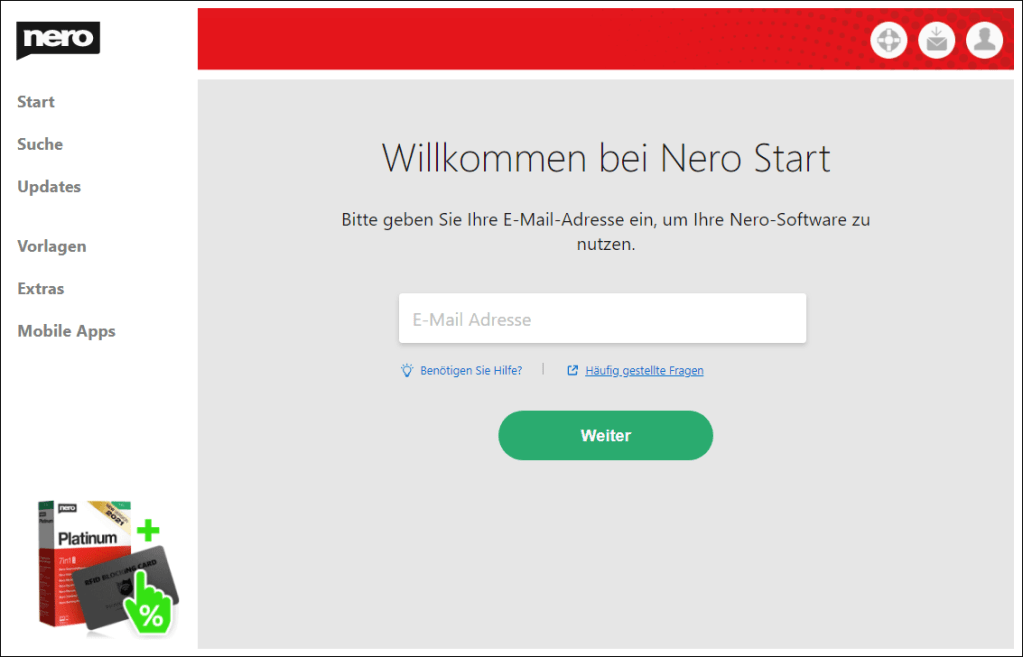 Nach dem Erhalt starten Sie die InstallationNach abgeschlossener Installation öffnen Sie mit "Starten" die Schaltzentrale "Nero Start"Geben Sie dort Ihre Email-Adresse einGeben Sie das Passwort ein, welches an diese Adresse gesendet wurdeGeben Sie hier Ihren Aktivierungscode einLassen Sie diesen Hake gesetzt, um alle Software zu erhalten oder entfernen Sie Ihn für gezielte InstallationNero DuplicateManager ist sofort verfügbar, weitere kostenlose Anwendungen werden herunter geladenDen Fortschritt sehen Sie auf der Startseite und unter "Updates"Eventuell schließt sich Nero Start um sich selbst zu aktualisieren, öffnen Sie ihn dann erneut, kurz darauf ist alles benutzbarBeim ersten Start des Nero DuplicateManager akzeptieren Sie die EULA, der Live Guide erleichtert Ihnen den Einstieg