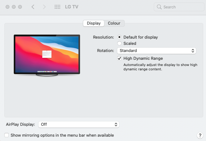 With a Mac the process is pretty straight forward. Connect your HDR TV or display to the Mac via HDMI. Under System Preferences > Display ensure that "High Dynamic Range" is checked.